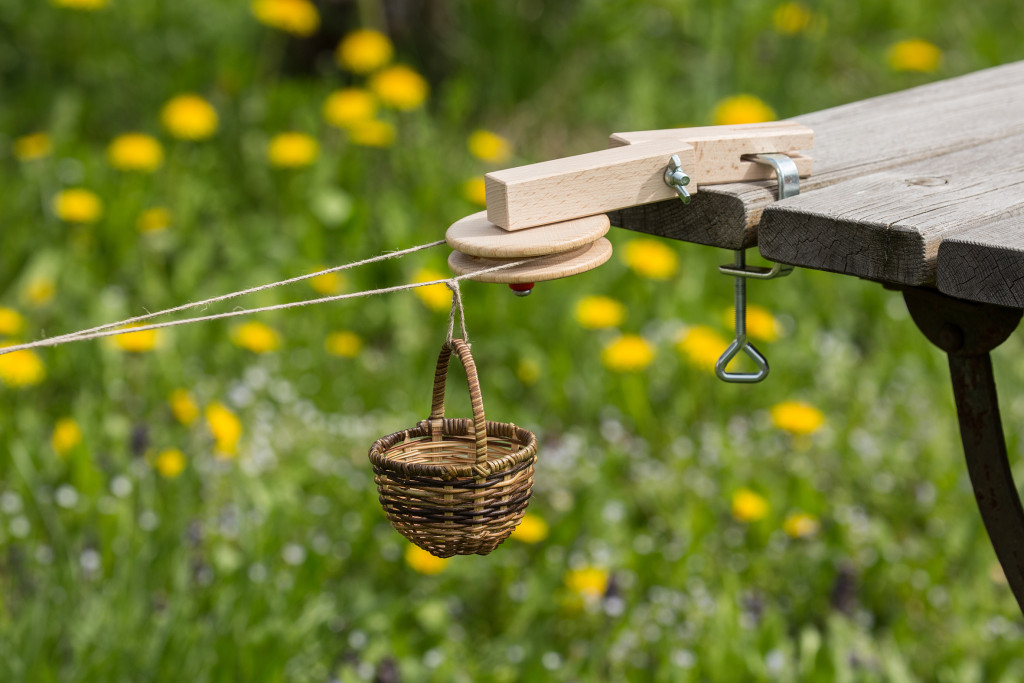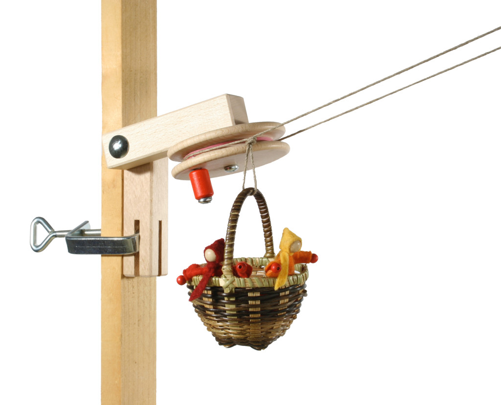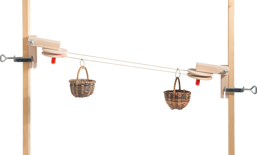 10 méter kötél, két kis fonott kosár, két fém szorító és két összeszerelhető kerekes állomás