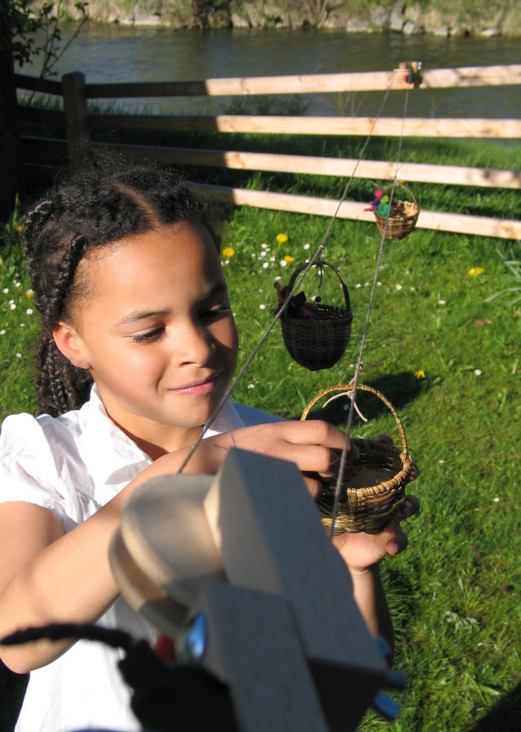 Töltsd meg a kosarakat utasokkal, tekerd el a kereket, és nézd, ahogy elindulnak! Ez a „csináld magad” kötélpálya készlet kötelet, két kis fonott kosarat, két fém szorítót és két összeszerelhető kerekes állomást tartalmaz. A Kraul Kosaras kötélpálya készlet egy szórakoztató szett gyermekek számára, amellyel beltéren és kültéren egyaránt lehet játszani.