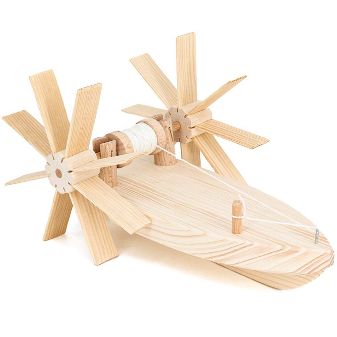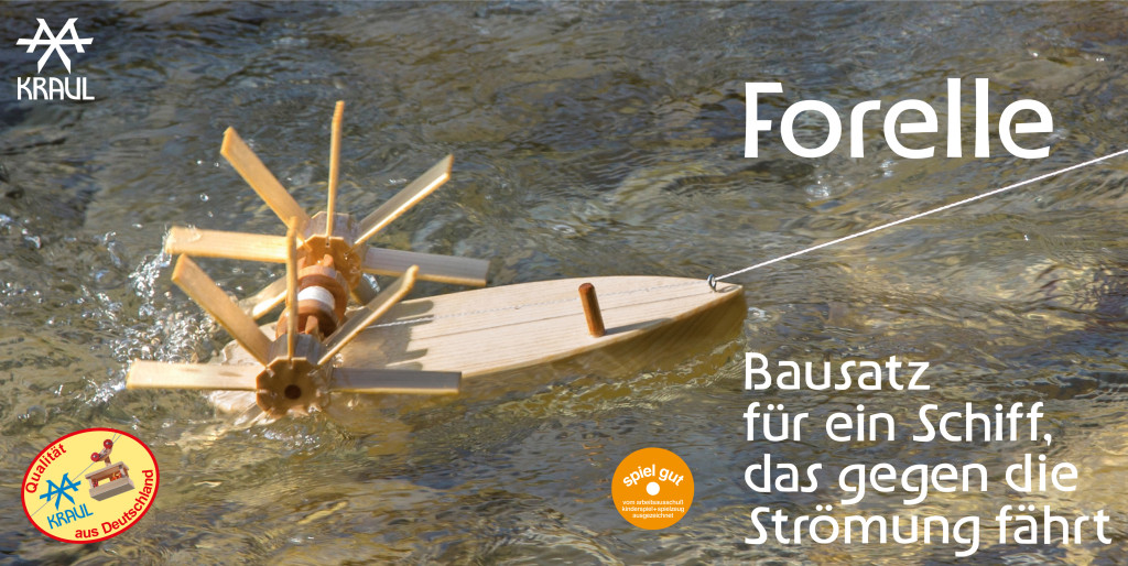 Ez a fából készült lapátkerekes hajó „csináld magad” készlet, ami a felfedezések utazására viszi a gyermekeket, miközben az áramlattal szemben eregetik a hajót, ami így visszatér hozzájuk. Ez a Pisztráng hajó kiváló játék patakokban és tenger-, vagy tóparton való játékhoz.